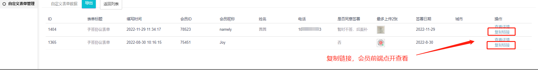 2、前端查看用户表单:是否允许普通会员前端查看。开启后,普通用户点击表单链接可以查看表单数据。关闭后普通会员查看不了,仅店铺助手管理员可以查看,前提店铺助手基础设置也勾选允许查看H5自定义表单。