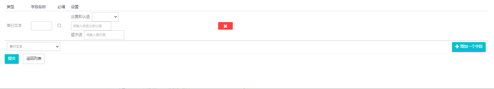 选中类型后点击添加字段,类型有:单行文本、多行文本、下拉框、多选框、单选框、图片、日期、城市、账号密码(账号密码是用于供应商申请表单使用时才会显示)。每个字段可以拖动互换位置。
